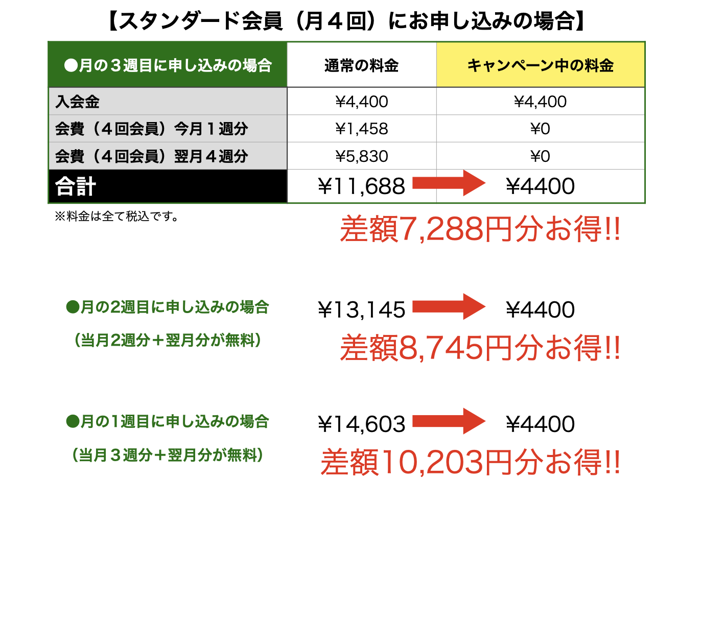 一例として、スタンダード会員(月4回)の場合のキャンペーン特典の割引額と、入会時のお支払い金額は下記の通りです。